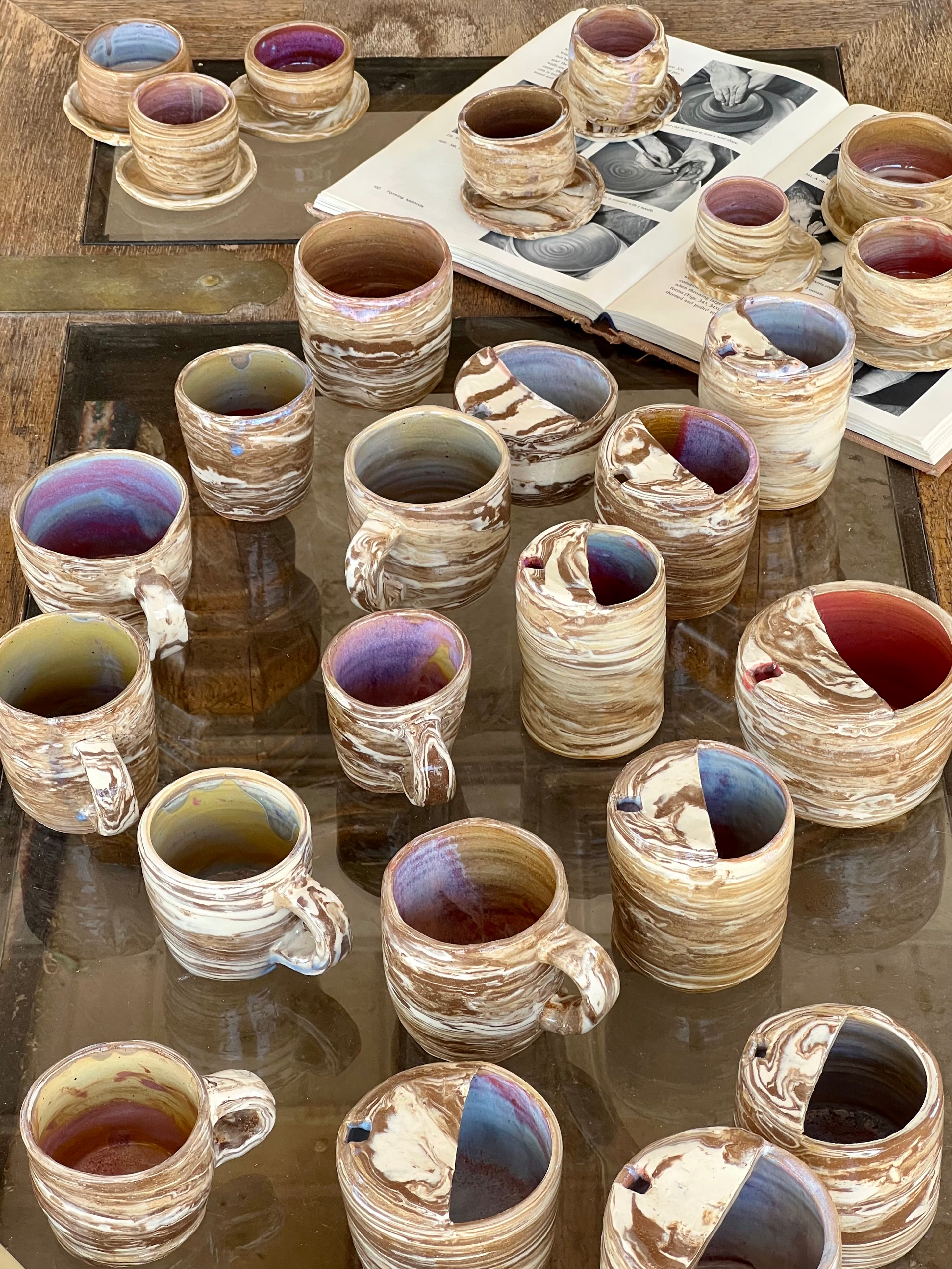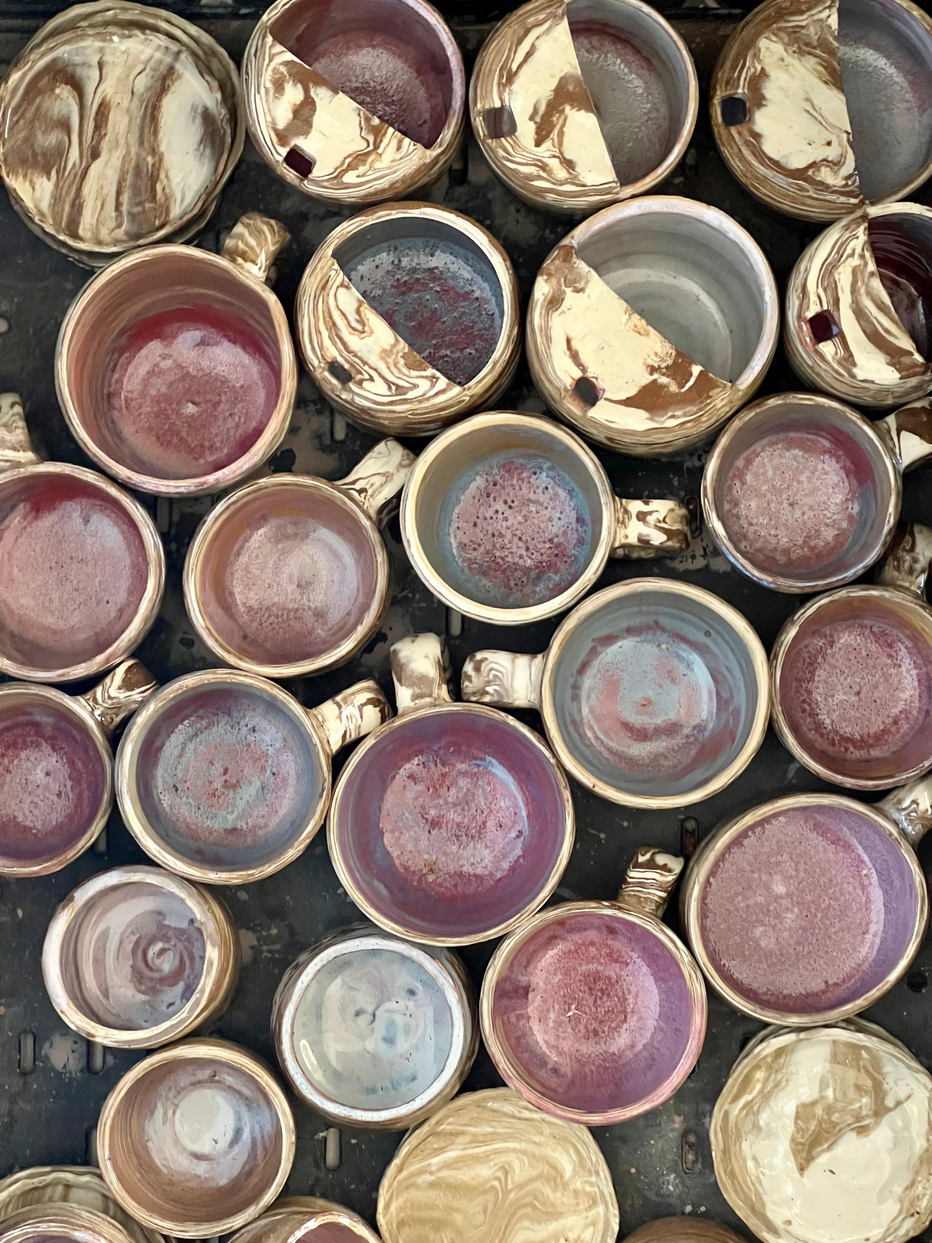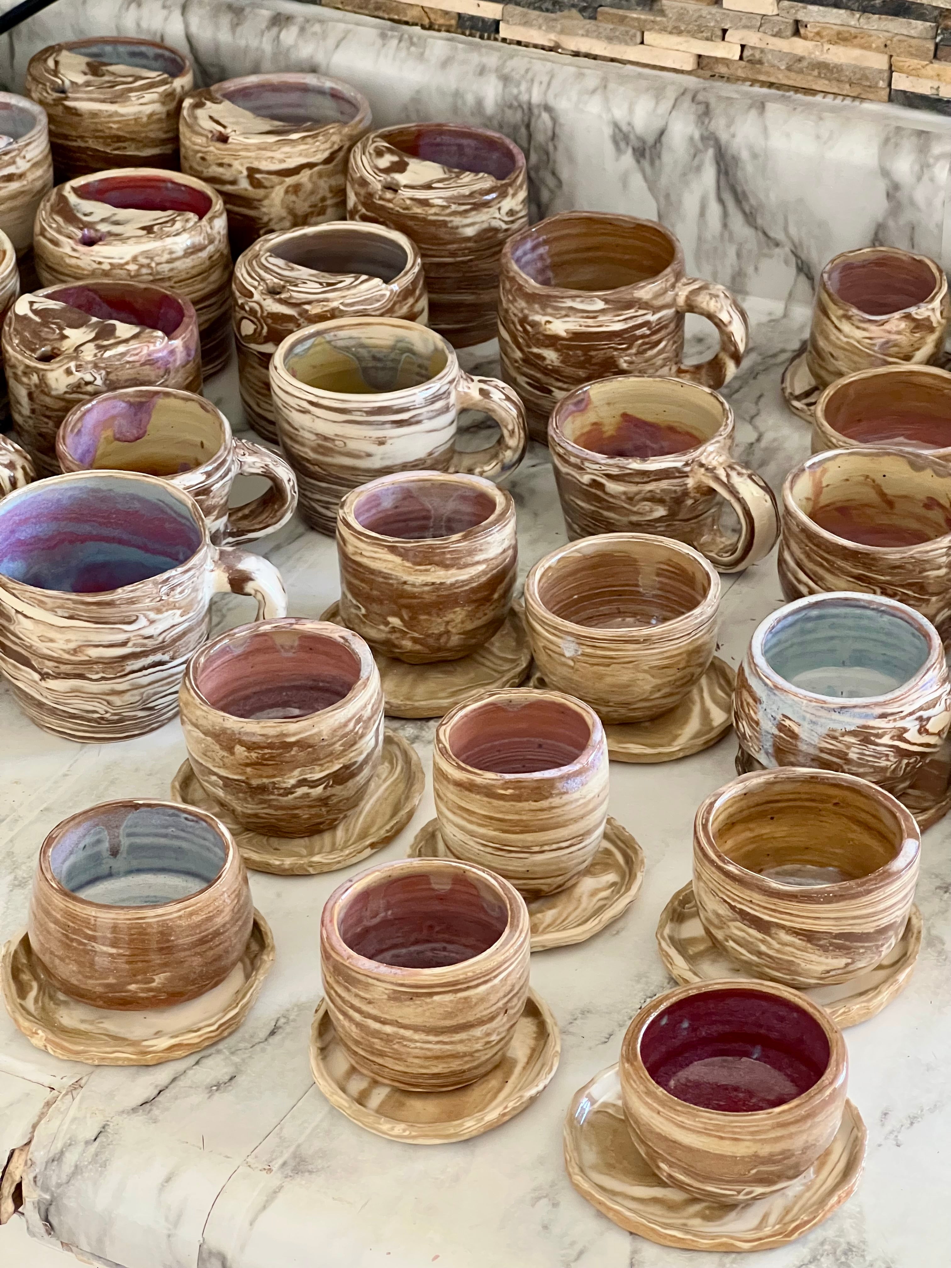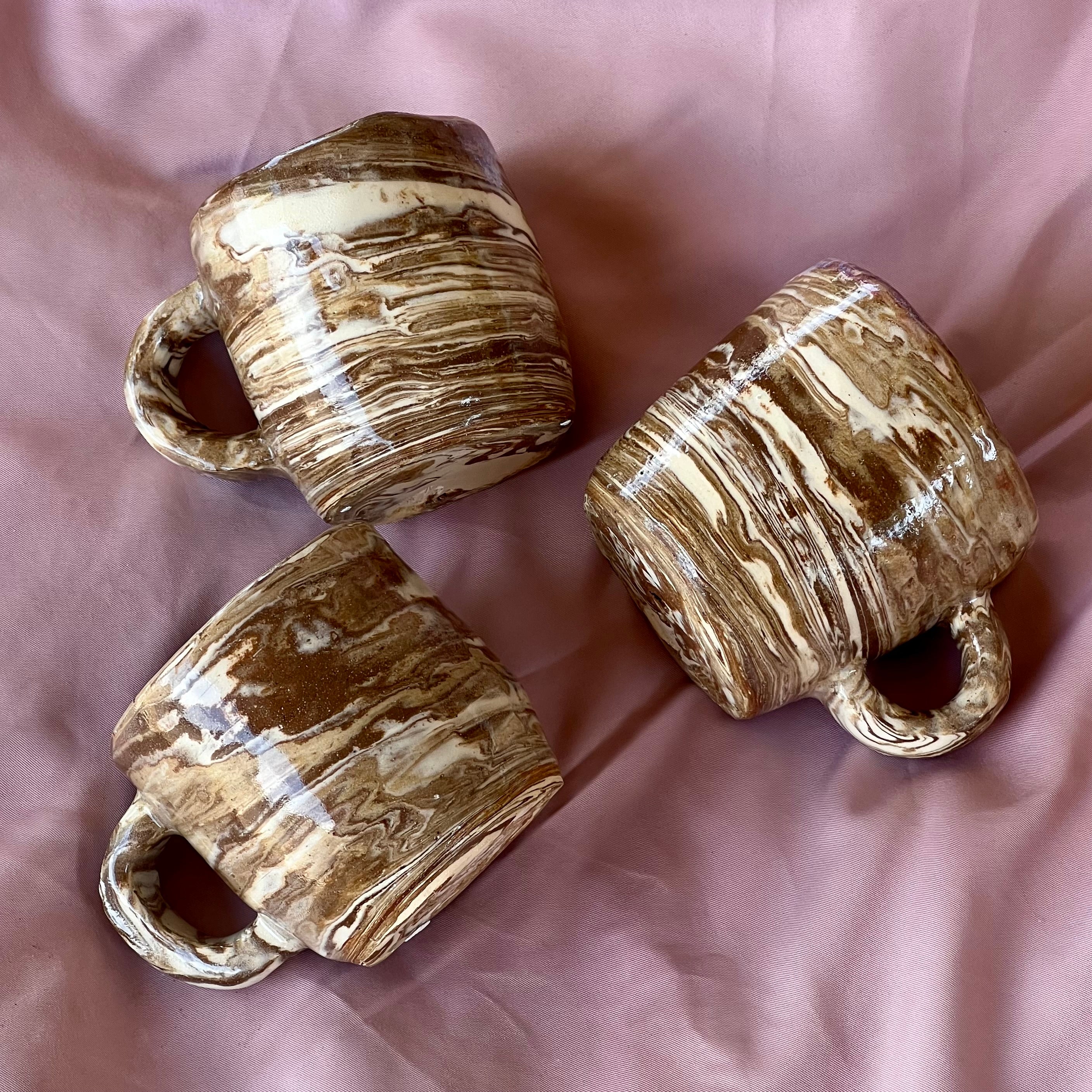 The marbled layers symbolize the layers within me — both dark & light. The asymmetrical shapes and the dents, which give the pieces their organic form, reflect imperfection, the unexpected indents in what I might hop to perfect but even with these flaws, they remain to be comforting, interesting with a purpose/curiosity to commune with.