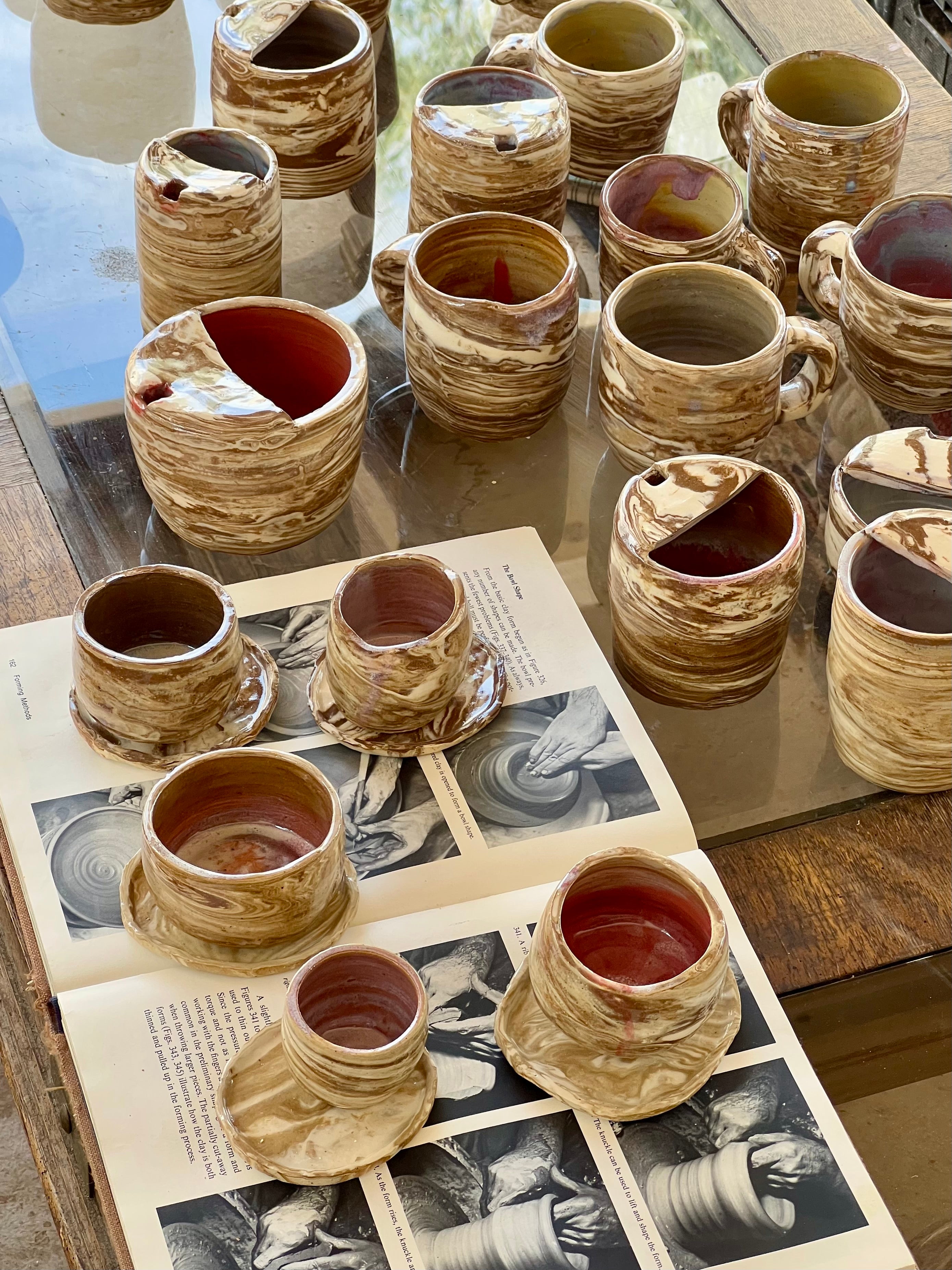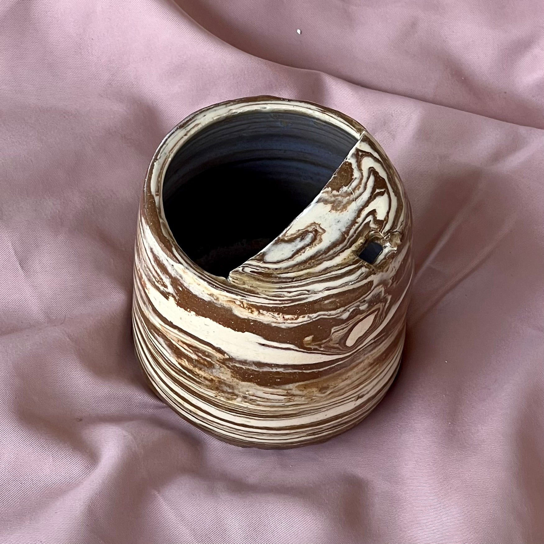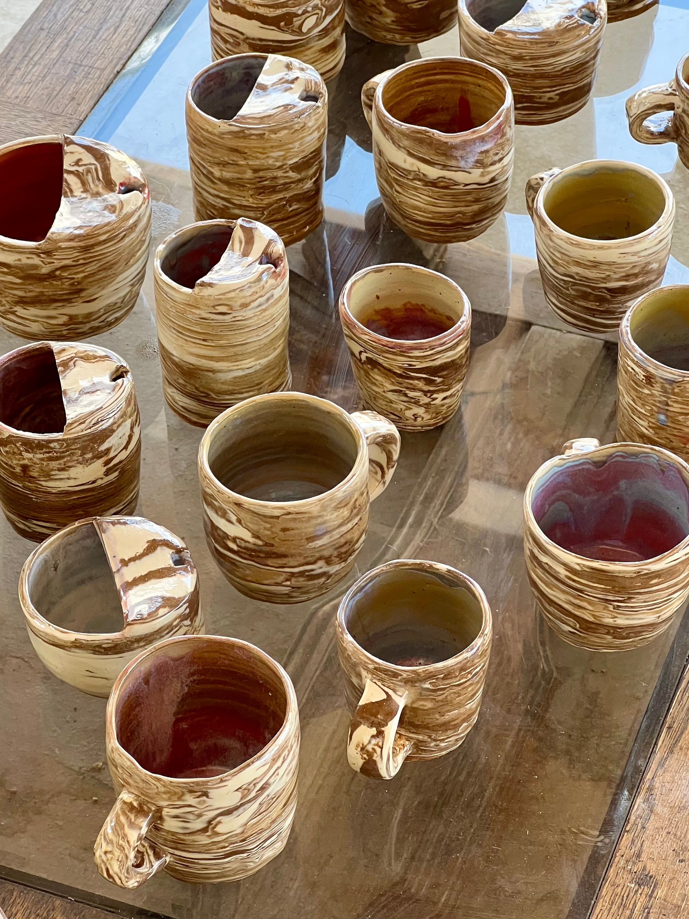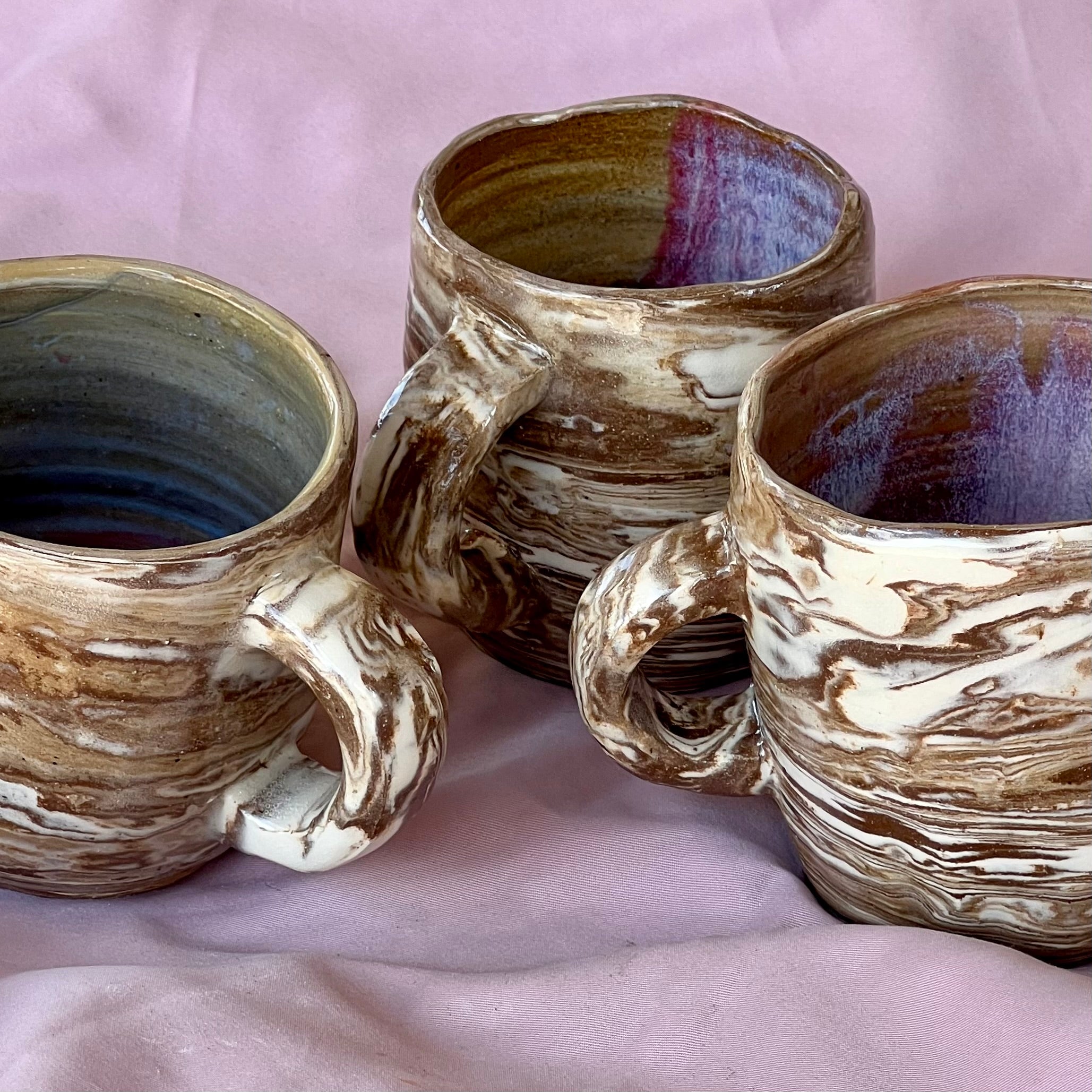 The marbled layers symbolize the layers within me — both dark & light. The asymmetrical shapes and the dents, which give the pieces their organic form, reflect imperfection, the unexpected indents in what I might hop to perfect but even with these flaws, they remain to be comforting, interesting with a purpose/curiosity to commune with.